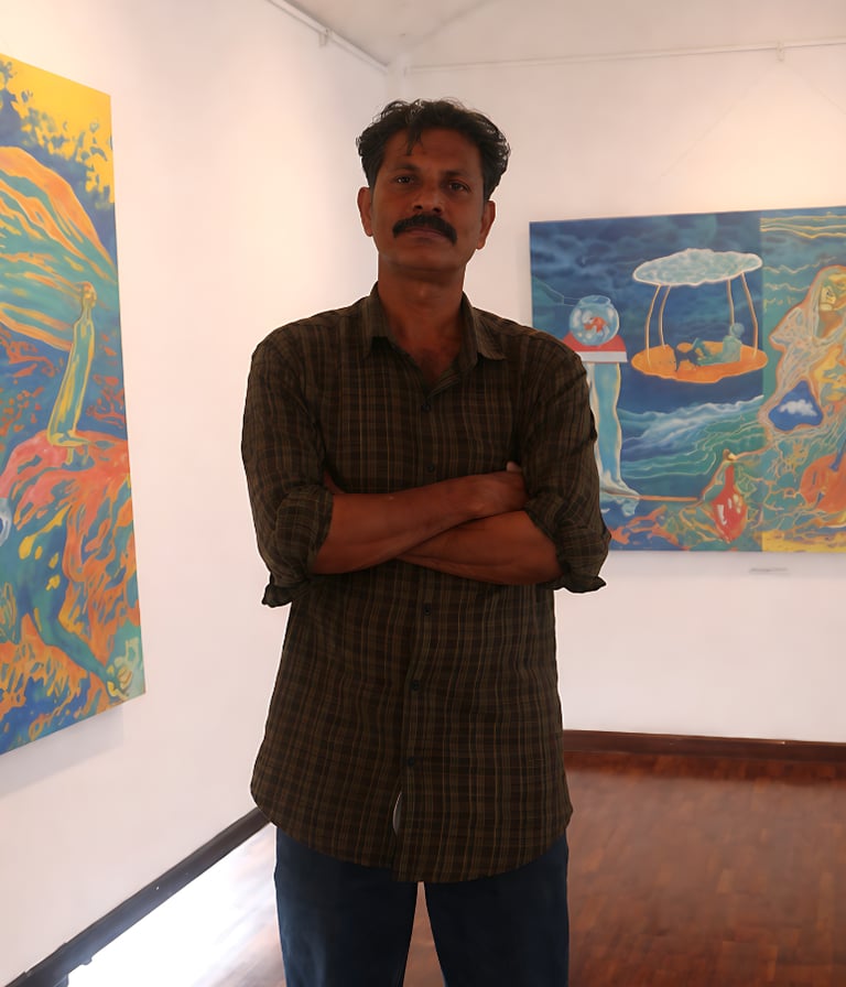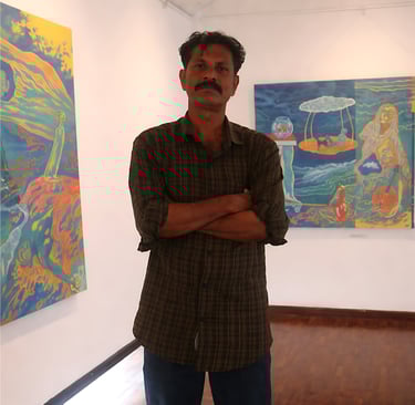 I am a contemporary Indian artist, born in 1964 and based in Calicut. My artistic practice is deeply rooted in humanism and ecology. In my early works, I explored humanist ideas, focusing on the dignity, struggles, and lived experiences of marginalized communities.